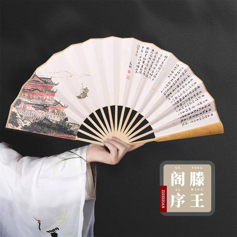 滕王閣扇子折扇蘭亭序男項書道古詩岳陽楼記古風宣紙扇面男折り畳み扇