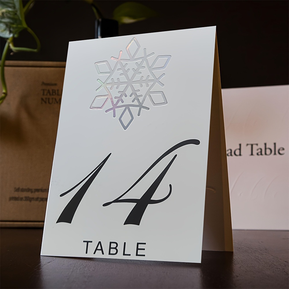 外国貿易の人気スポットの箔押しレーザー雪花結婚式の席カードv型は1-15テーブルナンバーの縦型テーブルカードに立っている