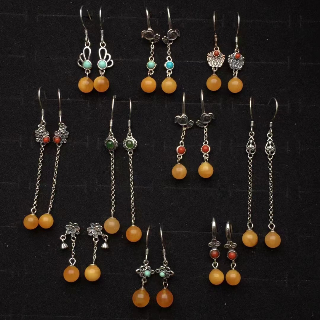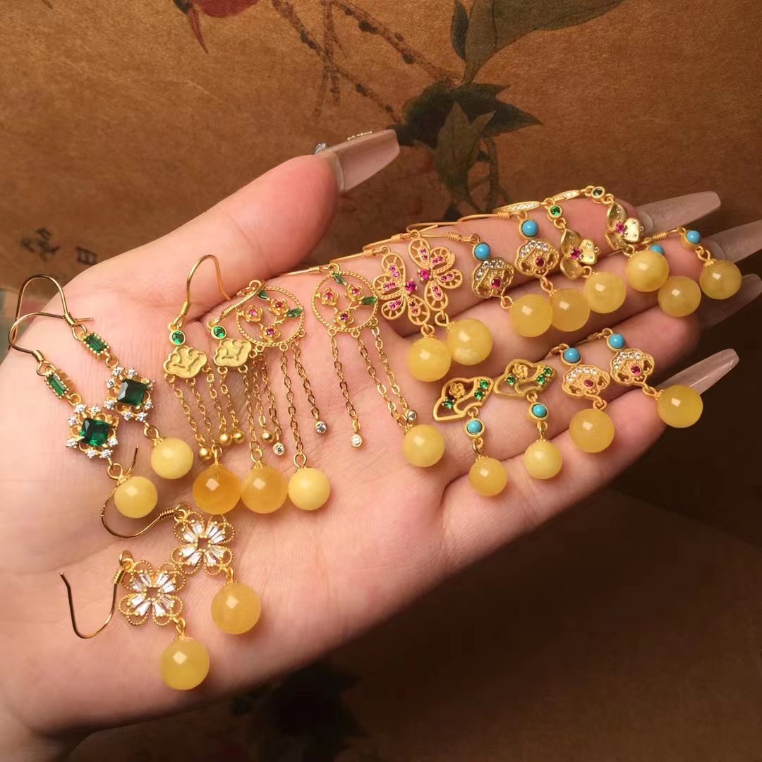 天然蜜ろうイヤリング925銀モザイク鶏油黄琥珀蜜ろうピアス可塘メーカー卸売り直販
