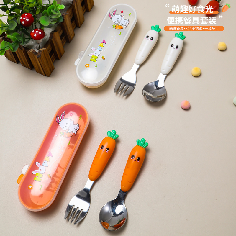 新型304ステンレス子供フォークスプーンセット赤ちゃん補助食飼育食器かわいいニンジン訓練フォークスプーン