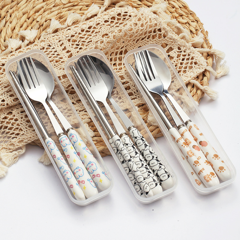 かわいい陶磁器携帯食器箸フォークスプーン三点セット学生屋外旅行プレゼント食器セット