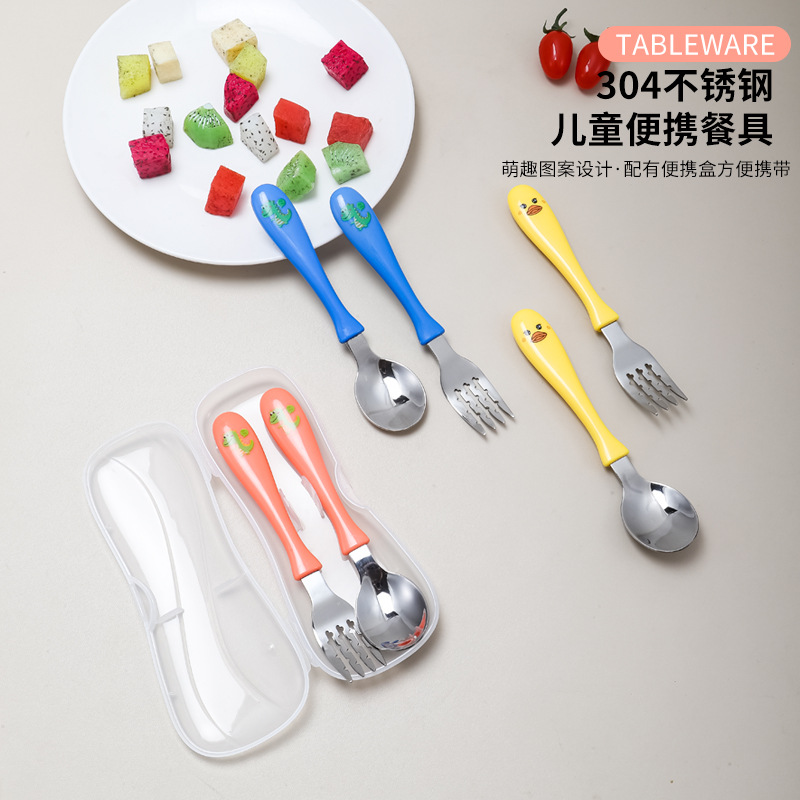 新しい304ステンレスの補助食品のスプーンのフォークの赤ちゃんの訓練のスプーンの子供の食器のセットの収納箱の漫画のスプーン
