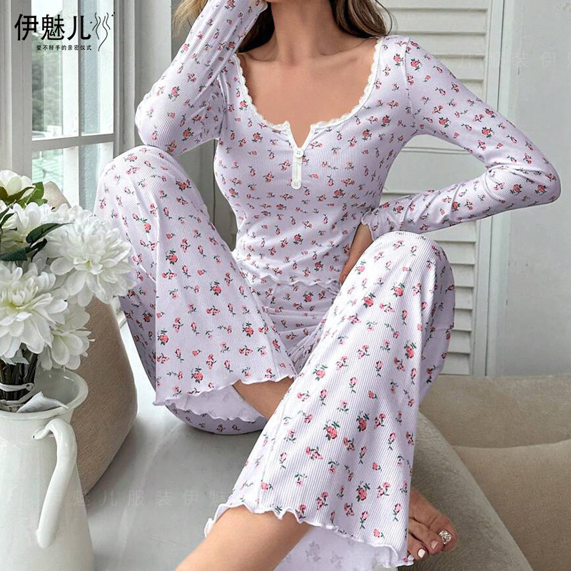 国境を越えて爆発した欧米風秋冬ホームウェアセクシーカジュアルファッション長袖長ズボンパジャマ2点セット女性