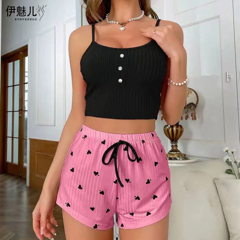 国境を越えた欧米の2024夏のパジャマ2点セットのプリントカジュアルなセクシーなストラップ半ズボンの家庭服セット