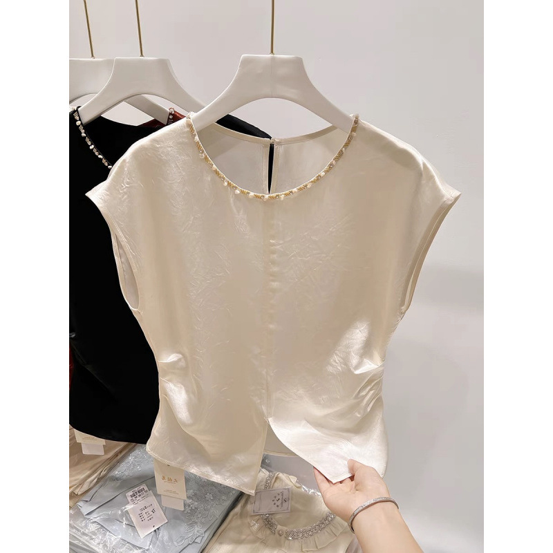 2025 新韓国スタイルスリムラウンドネックビーズ裾スリットプリーツエンボスノースリーブシフォンシャツ女性の夏