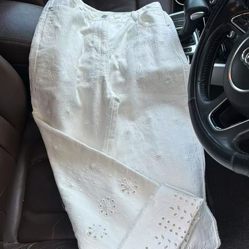 アメリカのハイストリートデザインの女性用刺繍入り中空ジーンズ、春夏のスリムなワイドレッグレースカジュアルフロアレングスパンツ