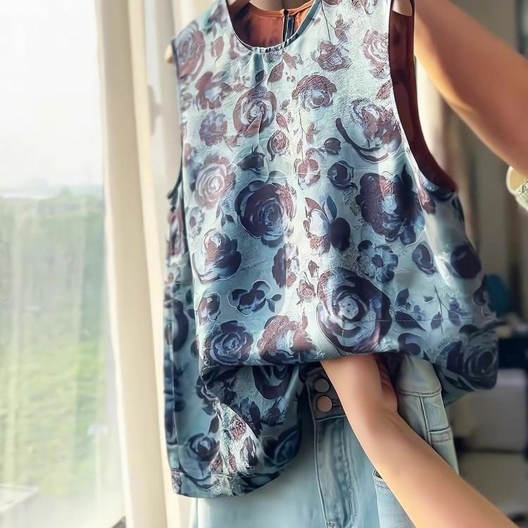 新しい中国風のブルーローズプリントノースリーブトップ女性のための 2025 夏の新しいスタイルのラウンドネックベストシャツ