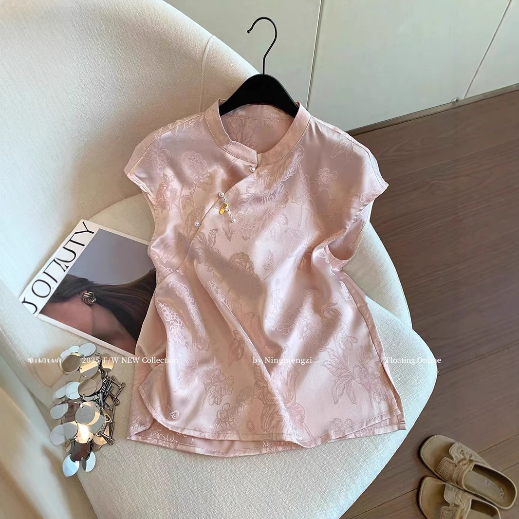 新しい中国風のピンクのダークパターンジャカード模造酢酸ノースリーブトップ女性のための 2025 夏の新しい甘い年齢を減らす気質シャツ