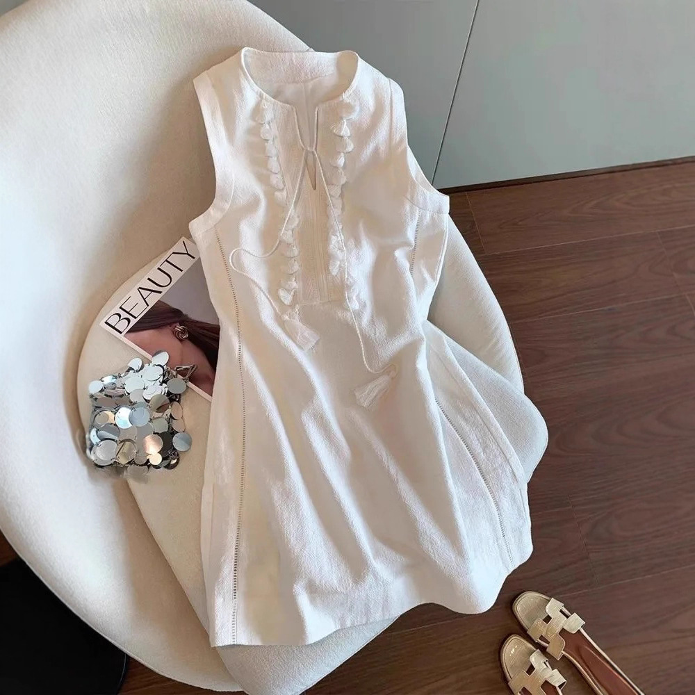 フレンチエレガントなレトロファッショナブルなタッセルステッチラウンドネックドレス女性のための 2025 夏の新しいノースリーブベスト