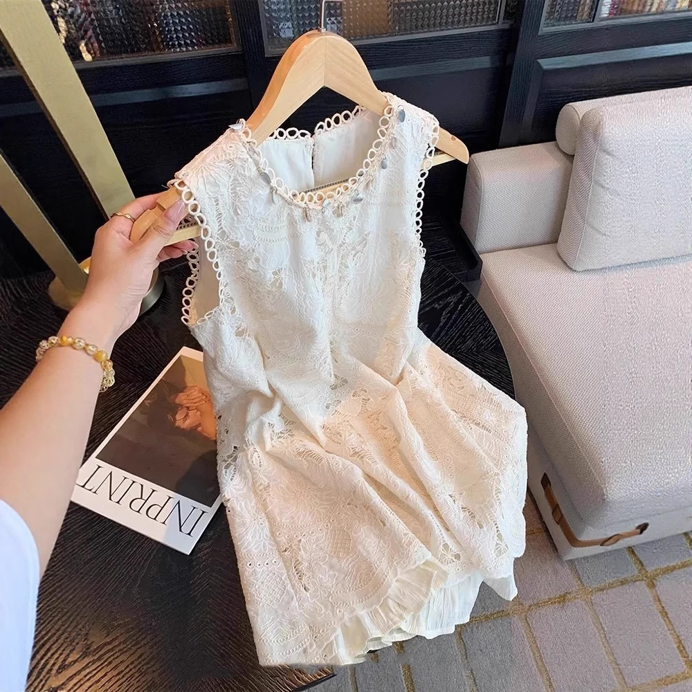 フレンチエレガントでファッショナブルなかぎ針編みレースステッチラウンドネックノースリーブドレス女性のための 2025 夏の新しいスカート