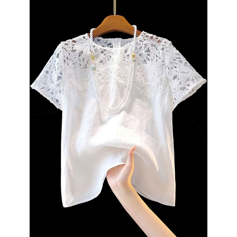 ホワイトヘビーデューティーレース中空半袖Tシャツレディース2025夏新作シンプルカジュアル万能Tシャツトップ
