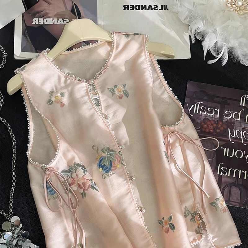 2025 夏新中国風ファッション重工業刺繍スリムベスト女性の新しい国民風多用途バックルノースリーブトップ