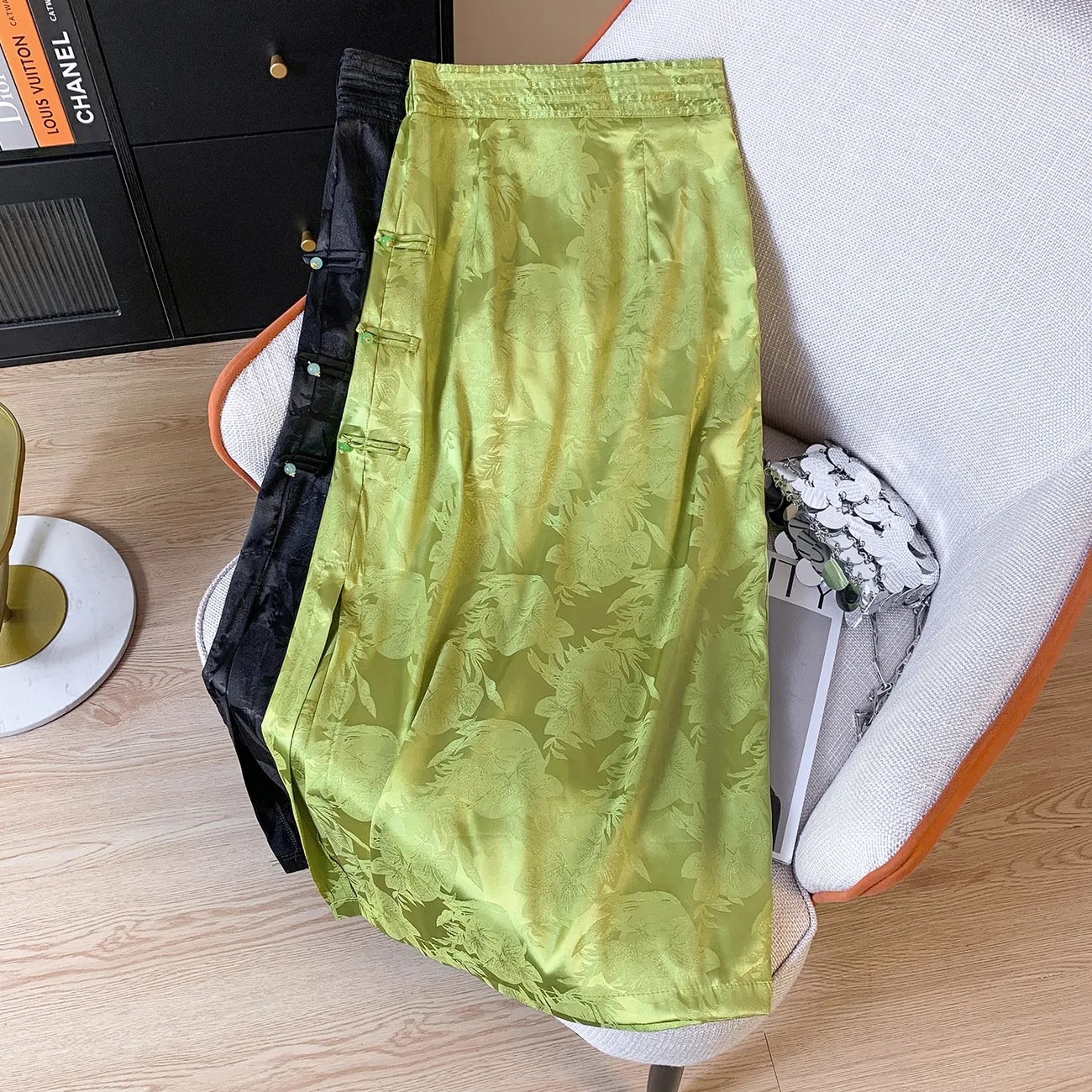 クリアランス夏の新しい中国風ジャカード国民風バックル模造酢酸ハイウエスト新しいスリットスカート女性のための新しいスタイル