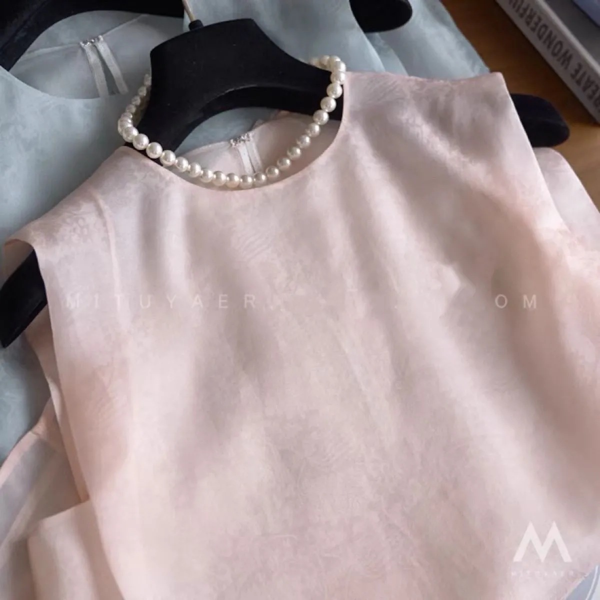 レトロ文学染め二層模造シルク模造オーガンザサイドスリットライト中国風ノースリーブベストシャツトップ女性用