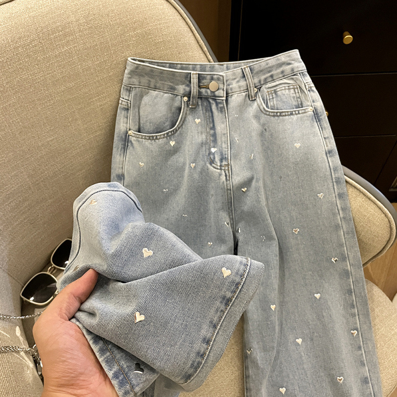 韓国風甘い気質ライトブルー愛コントラストハイウエストストレートルーズ痩身ワイドレッグデニムパンツ女性のための新しいスタイル