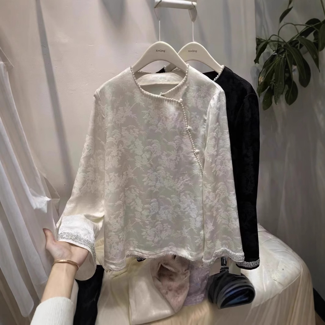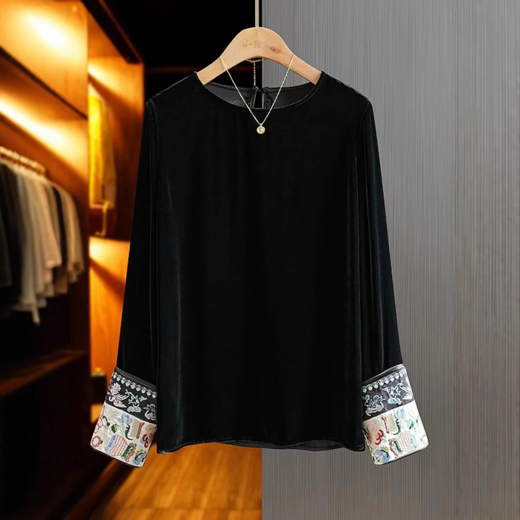 ハイエンドの黒いベルベットの上着の女装2024秋の新しい刺繍の丸首はゆったりしていて痩せている長袖の気質のシャツです。