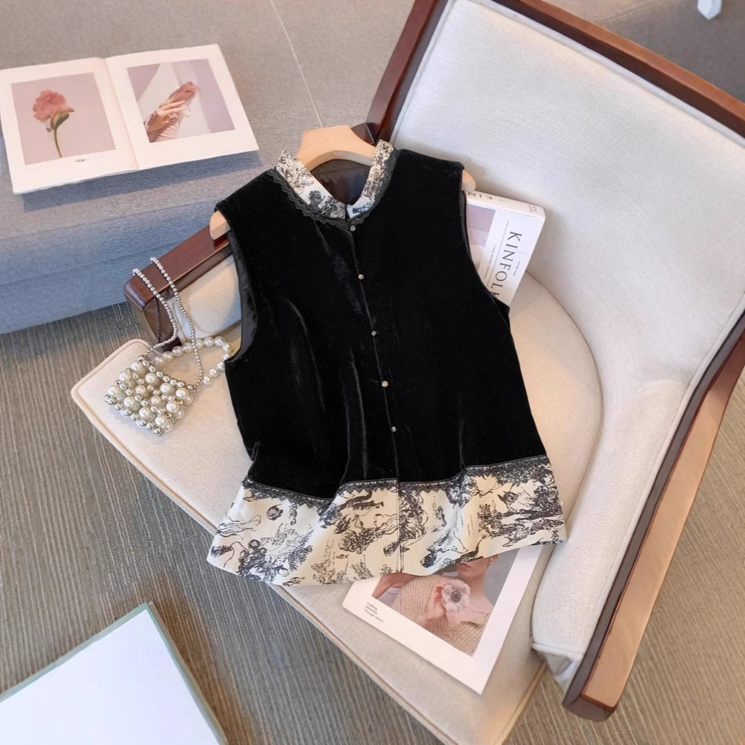 新しい中国風のボタンベルベットベストジャケットトップ女性のための 2024 秋の新しいノースリーブチョッキベスト