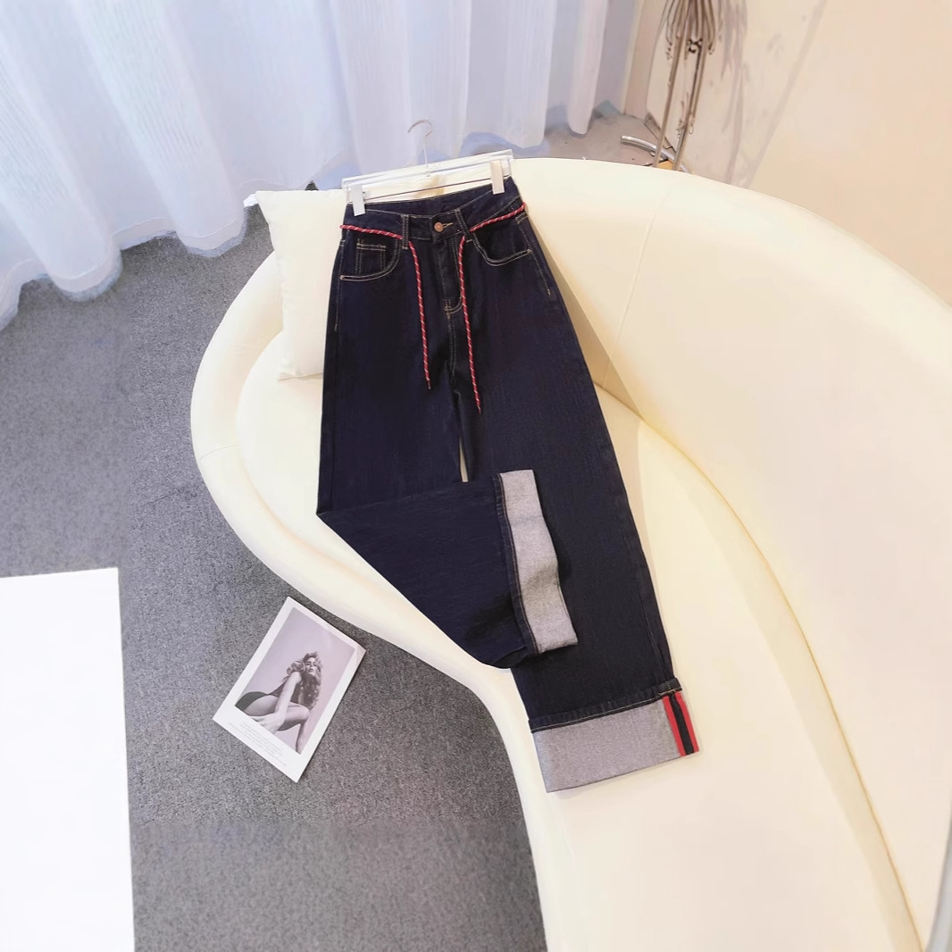 韓国版の青は色の赤いズボンの裾を打って腰のひもの高い腰のまっすぐな筒をひっくり返してゆったりしています。