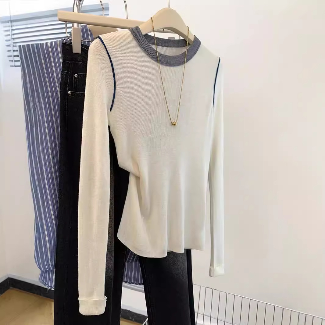 色の長袖の丸首のニットの女性の春秋の2024の新型の小さい子のセーターの中で顔のやせている上着の底のシャツを現します。