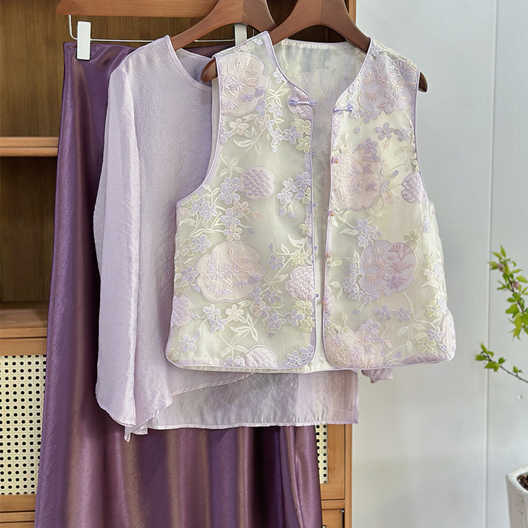 紫色の新しい中国風模造オーガンジー刺繍ベスト女性の薄いツーピースセット若いスタイルのハイエンド中国風の美しいベスト