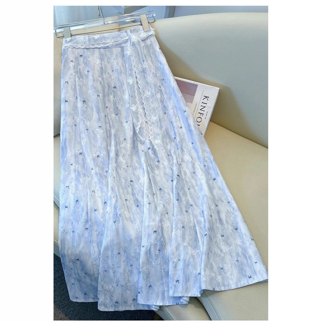 ブルー花柄スカート女性のための 2025 新しい夏フレンチフレッシュレースベルトミッドレングス A ラインアンブレラスカート