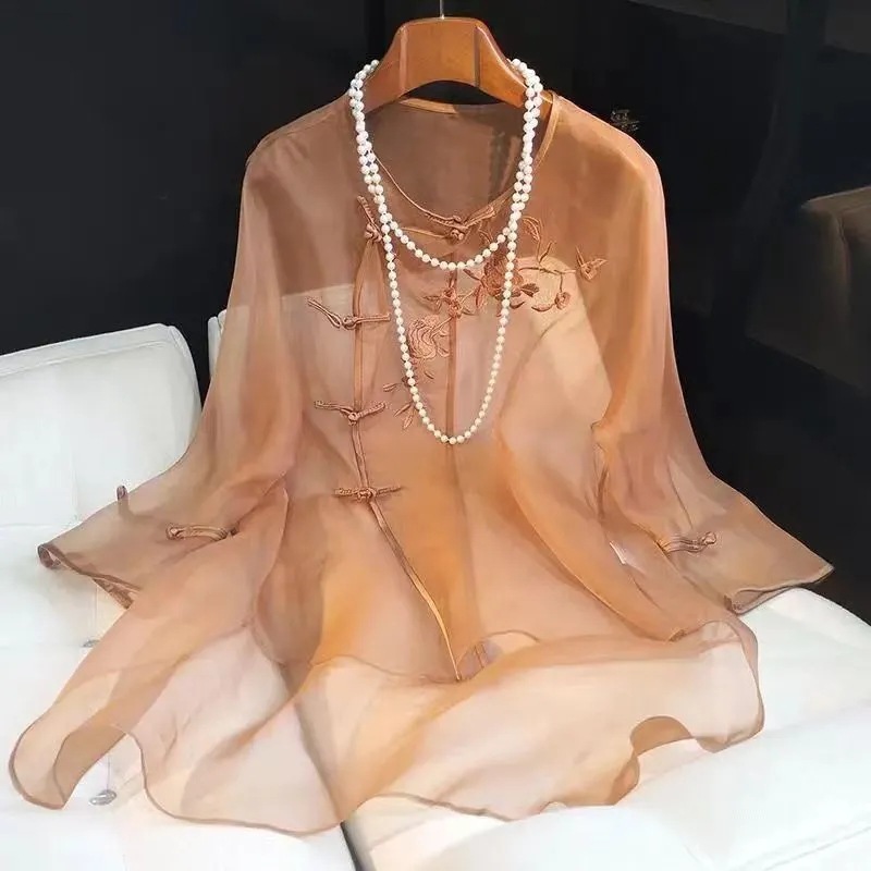 日焼け防止服七分袖トップ 2025 夏レトロバックル中国刺繍模造オーガンザトップ女性のシースルーシャツ