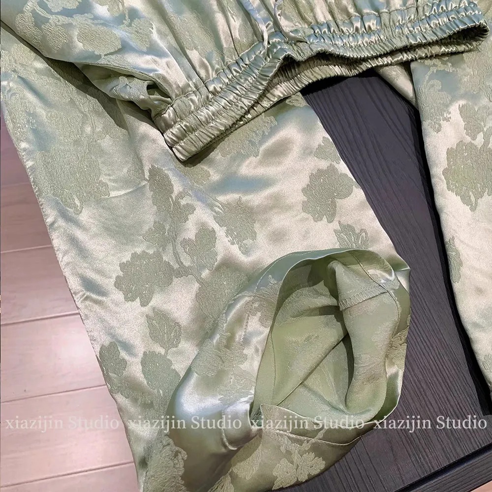 ミントマンボグリーンワイドレッグパンツ女性の夏の新しい中国風ジャカードハイウエストドレープデザインアイスシルクパンツ