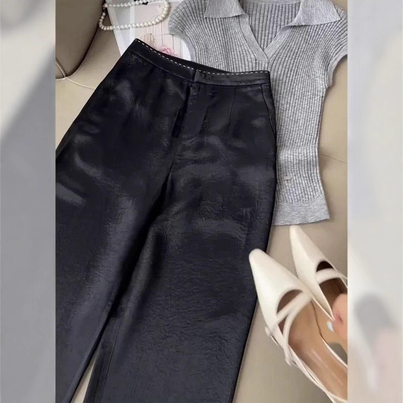 高品質の商品をお勧めします〜女性用ブラックイミテーションアセテートサテンパンツ、アイスシルクルーズドレープ、多用途ストレートワイドレッグパンツ