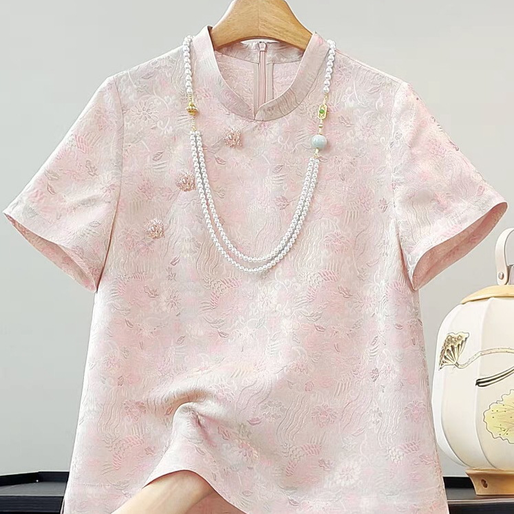 ピンクのレトロな新しい中国風の花柄シャツ女性のための夏の新しい気質年齢を軽減するジャカード中国風トップ半袖シャツ