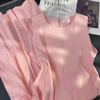 夏のティーブレイクフレンチプラセンタ風ピンクベストスカート気質大きいサイズ森系優しい風イミテーションコットンとリネンドレス