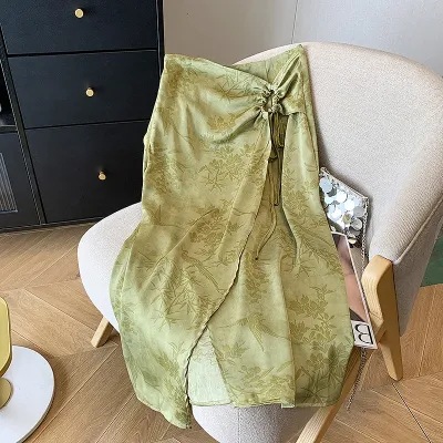 女性用の新しい中国風のツイストスカート、レトロな中国風のジャカード、ハイエンドの夏の気質、スリットストレートハイウエストスカート
