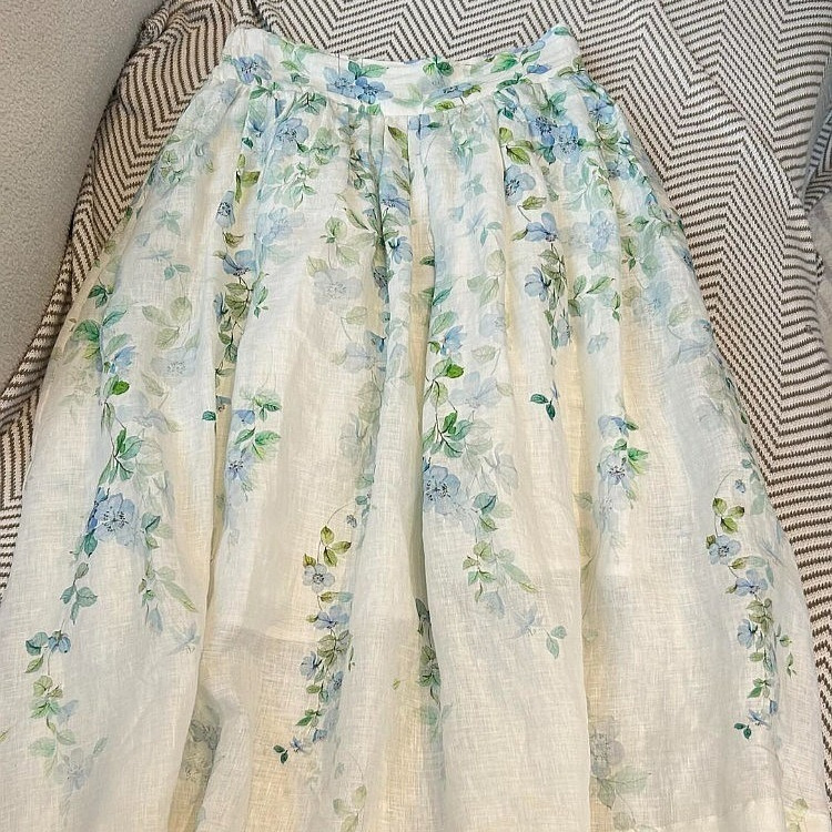 2025 新しいスタイルの小さなヒップカバー梨型ボディバークレー グリーン プリント イミテーション リネン A ライン スカート女性の夏