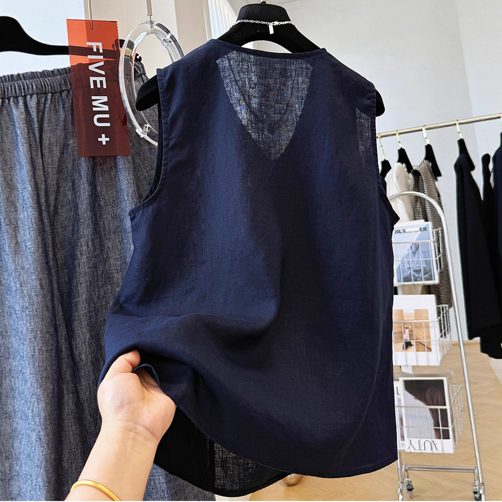 ハイエンドのレトロなヘビーウェイト刺繍イミテーションリネンベスト女性の夏薄い気質アウターノースリーブ V ネックトップ