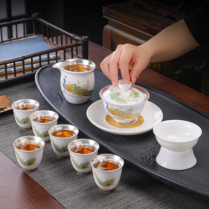 銀陶磁器カンフー茶器セットプレゼントエナメル彩蓋碗茶杯茶洗茶ポットセット家庭用