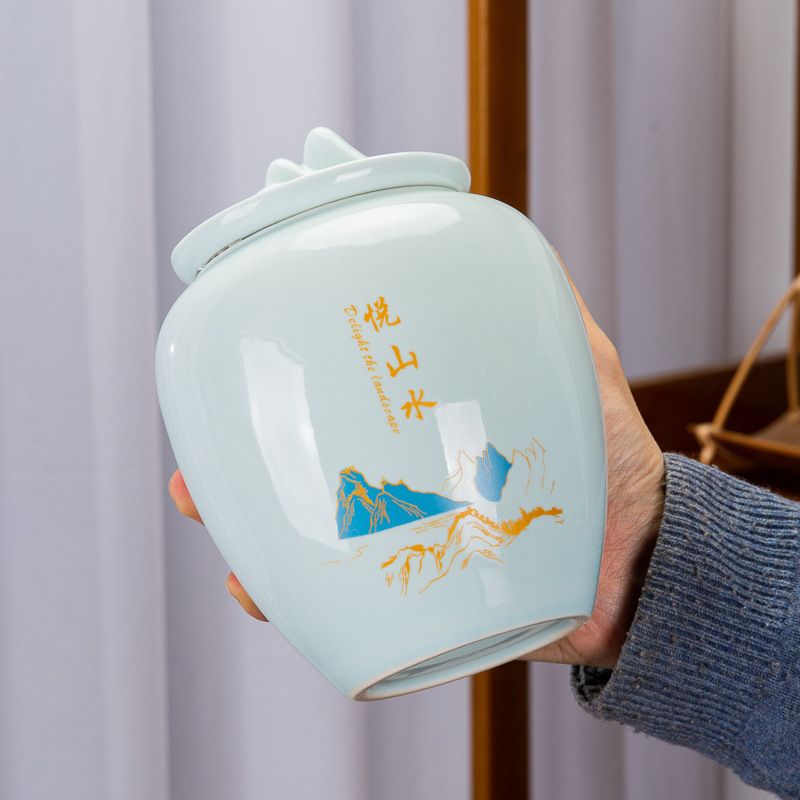 悦山水茶葉缶陶磁器茶缶乾燥果生薬五穀雑穀クコ茶葉缶共通ロゴ