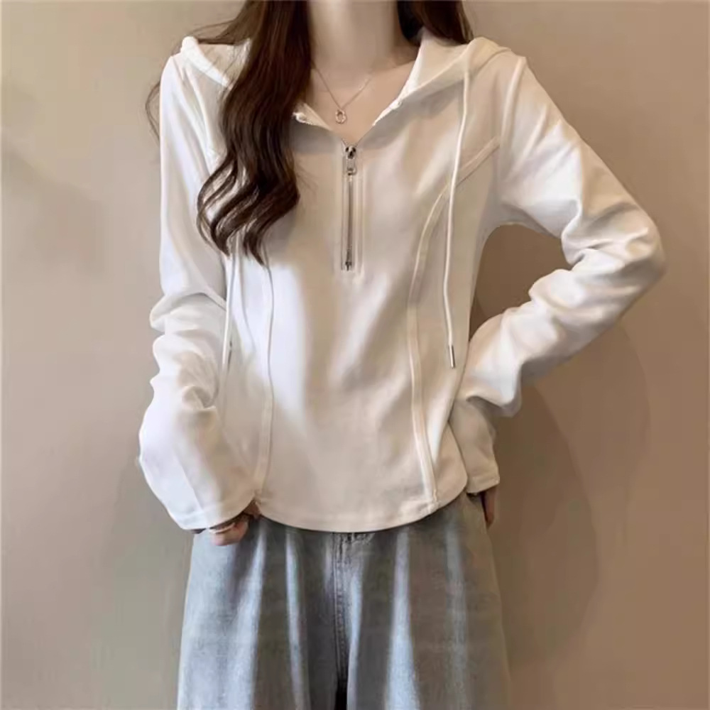 白い長袖tシャツの女性の新しいデザイン感のあるセーターの中に初秋には、シャツの短い上着の夏のファッションを着ています