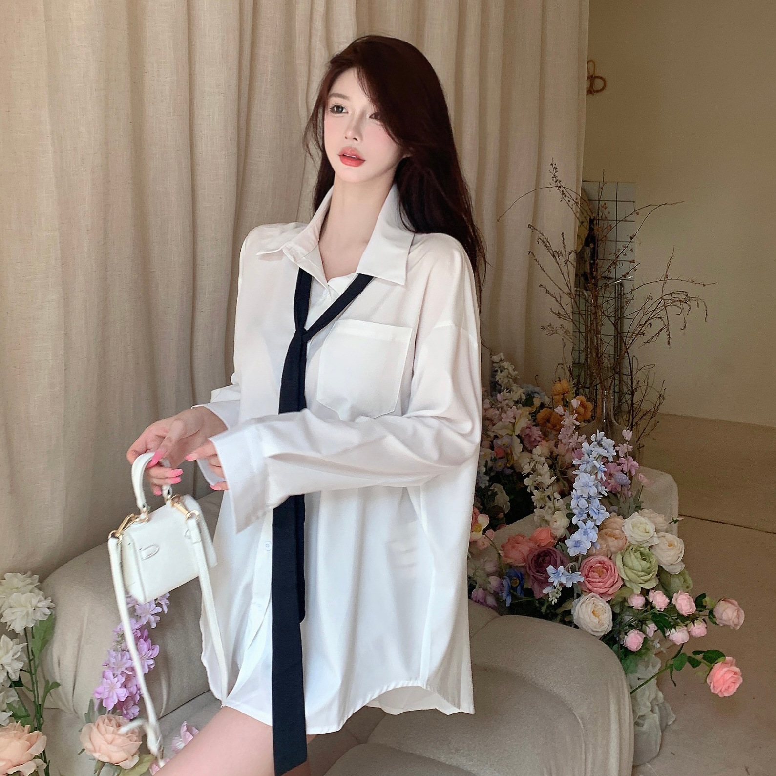 実拍2023秋装の新商品の怠惰な風の中で長いタイプのゆったりしたシャツの女性の大衆の復古の白いシャツの上着の潮