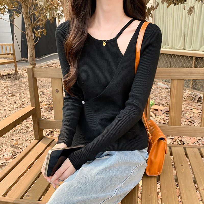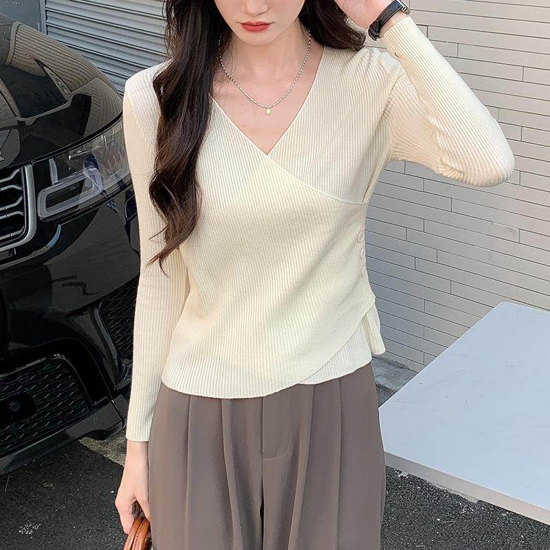 底のシャツの女性の秋冬の中で長袖のニットの不規則なvネックの早秋の上着のデザイン感の小さい大衆の軽熟のtシャツを掛けます。
