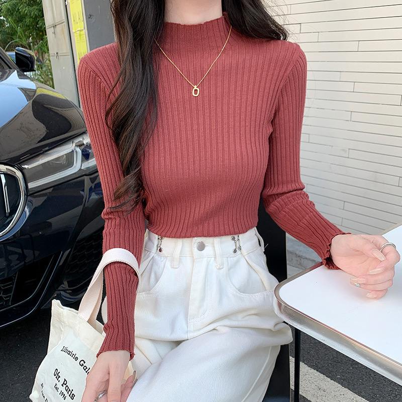 卸売りのニットの底のシャツの小さい内は長袖のtシャツの女性の薄い金の春の早秋の上着の半高襟の純色のセーターを掛けます。