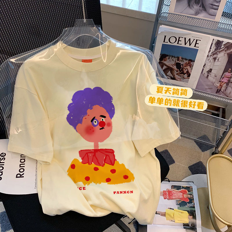 2022夏の韓国版趣味アニメプリント半袖tシャツゆるいカジュアル丸襟200グラム純綿上着