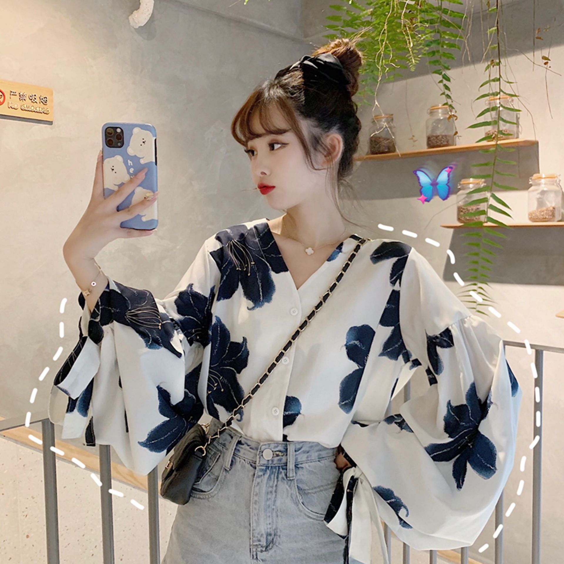 実写大サイズ2022新型百合デザイン小衆長袖シャツ復古港味灯籠袖vネックシャツ女
