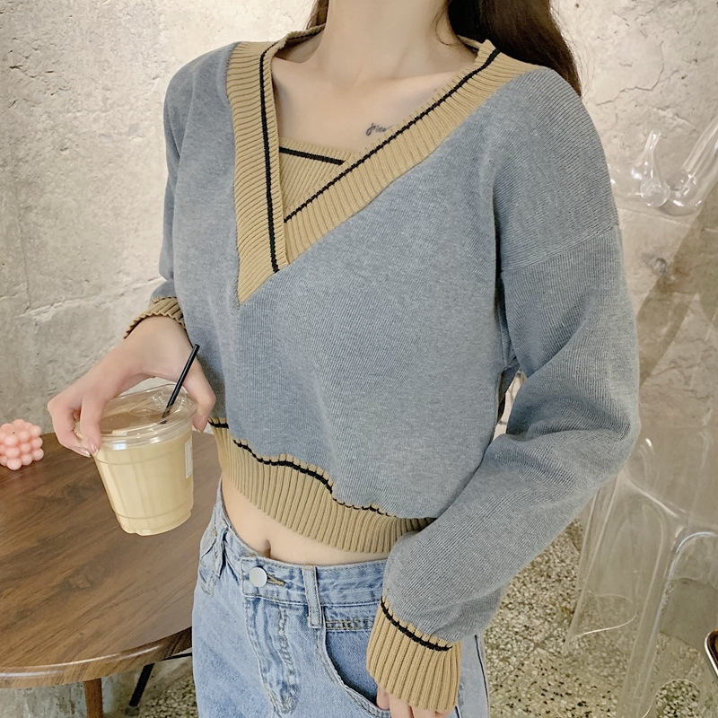 2022年早秋の新型怠惰な風の偽の2つの短い上着の復古的な洋風のゆったりしたvネックのセーターのニット