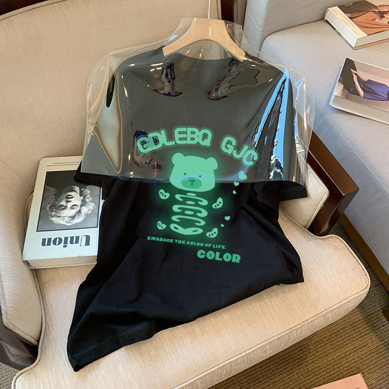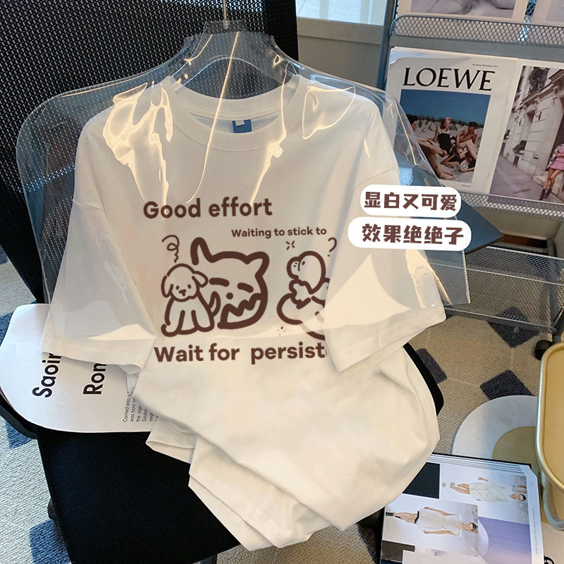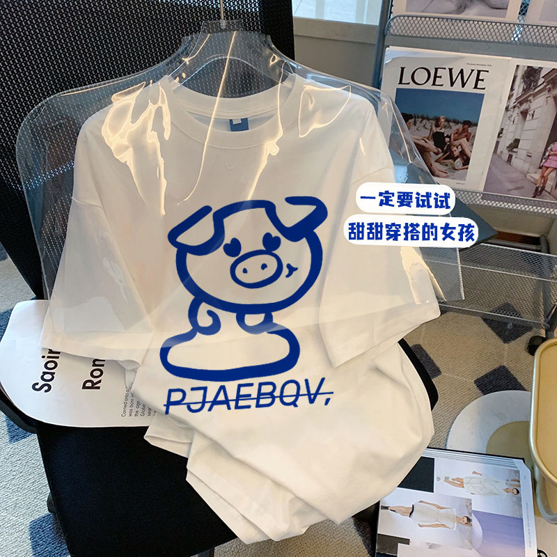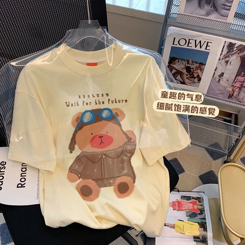 200グラム純綿肩引き2022年夏の新型ベアーアニメプリントゆるい半袖tシャツ女性上着潮