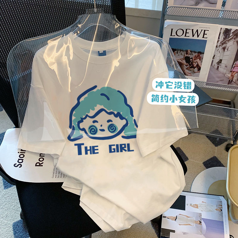 200グラムの純綿の肩の条の夏の新型の漫画のプリントのデザイン感の小さい大衆のゆったりしている上着の半袖のtシャツの女性
