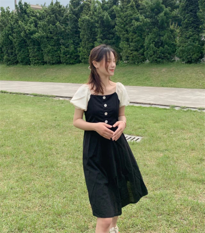 2022夏の小さい黒いスカートのロングスカートの方襟の気質の小さいスカートの甘いお茶の休みのスカートの女性のフランス式の復古する黒色のワンピース