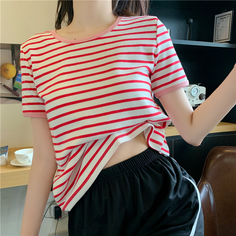 卸売り2022夏の新型insデザイン感小衆百合韓国甘い縞色半袖tシャツ女装
