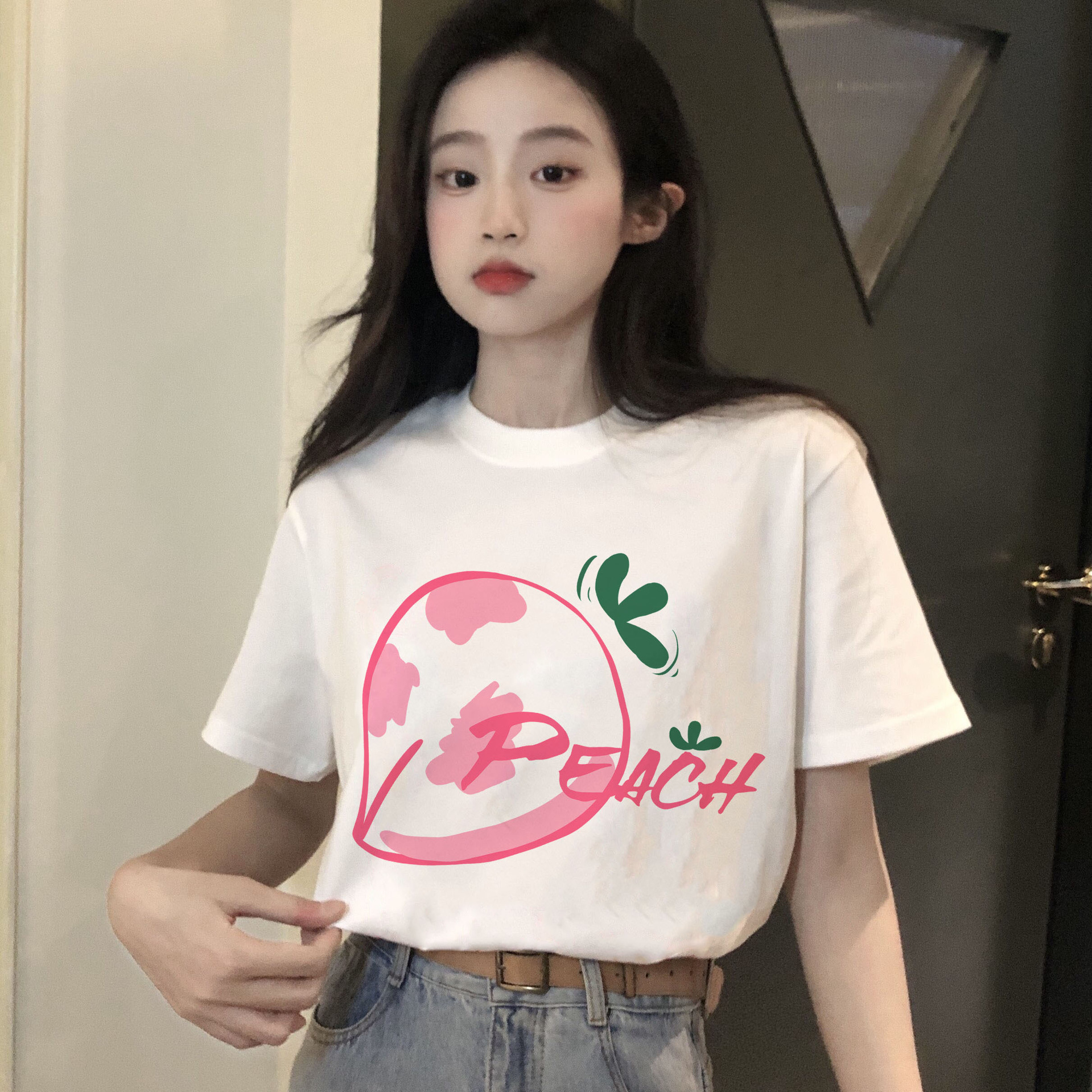 卸売りの大きいサイズの婦人服の太った妹の夏の2022年の新型の桃のプリントの半袖の学生の短いタイプのtシャツの上着