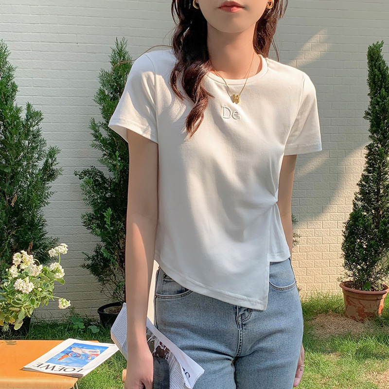 白の大衆の不規則な独特なtシャツの女性の半袖2022年夏の新型はやせている短い上着のデザイン感が現れます。