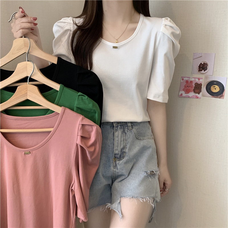 2022夏服新型フランス式泡袖丸襟正肩半袖tシャツ女性ゆったり純色シック純色上着