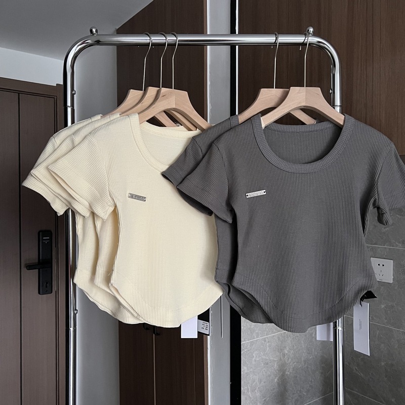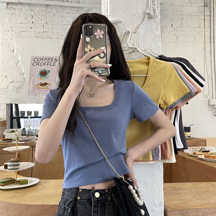 卸売りの方襟のtシャツの半袖の2023の新型の女性の夏の短いタイプの正肩の修身のchiの上着のギャルの風のinsの潮